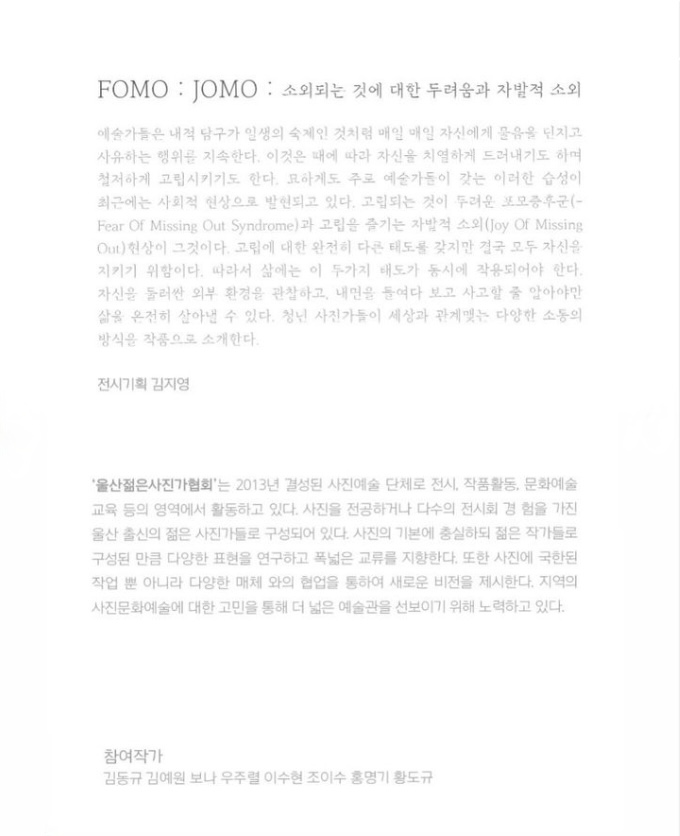 울산젊은사진가협회 <Fomo : Jomo 소외되는 것에 대한 두려움과 자발적 소외>